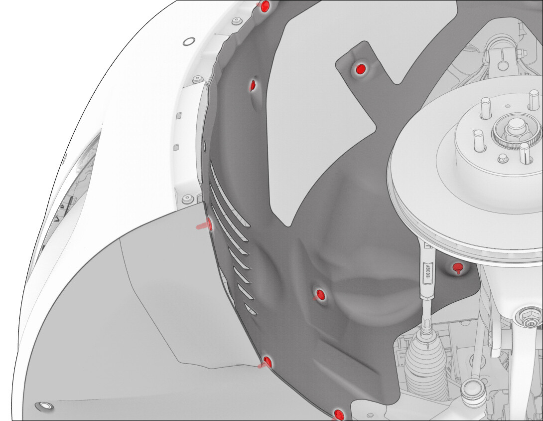- Remove the clips (x8) that attach the front LH wheel arch liner to the vehicle, and then pull the wheel arch liner towards the rear of the vehicle and out of the working area.