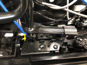 - Fasten the clips that attach the RH 2nd row seat cushion harness to the podium.