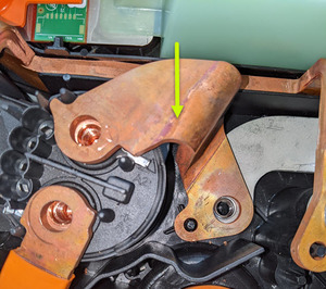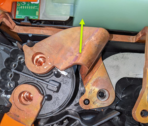 - Lift the HV battery fast charge positive inlet busbar straight up to remove it.