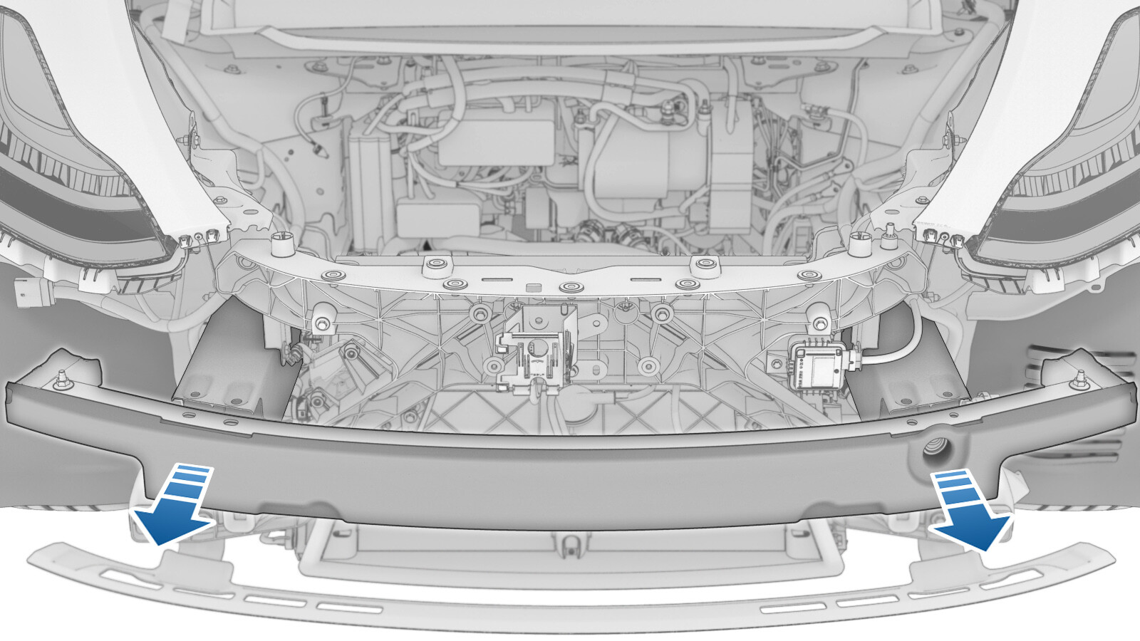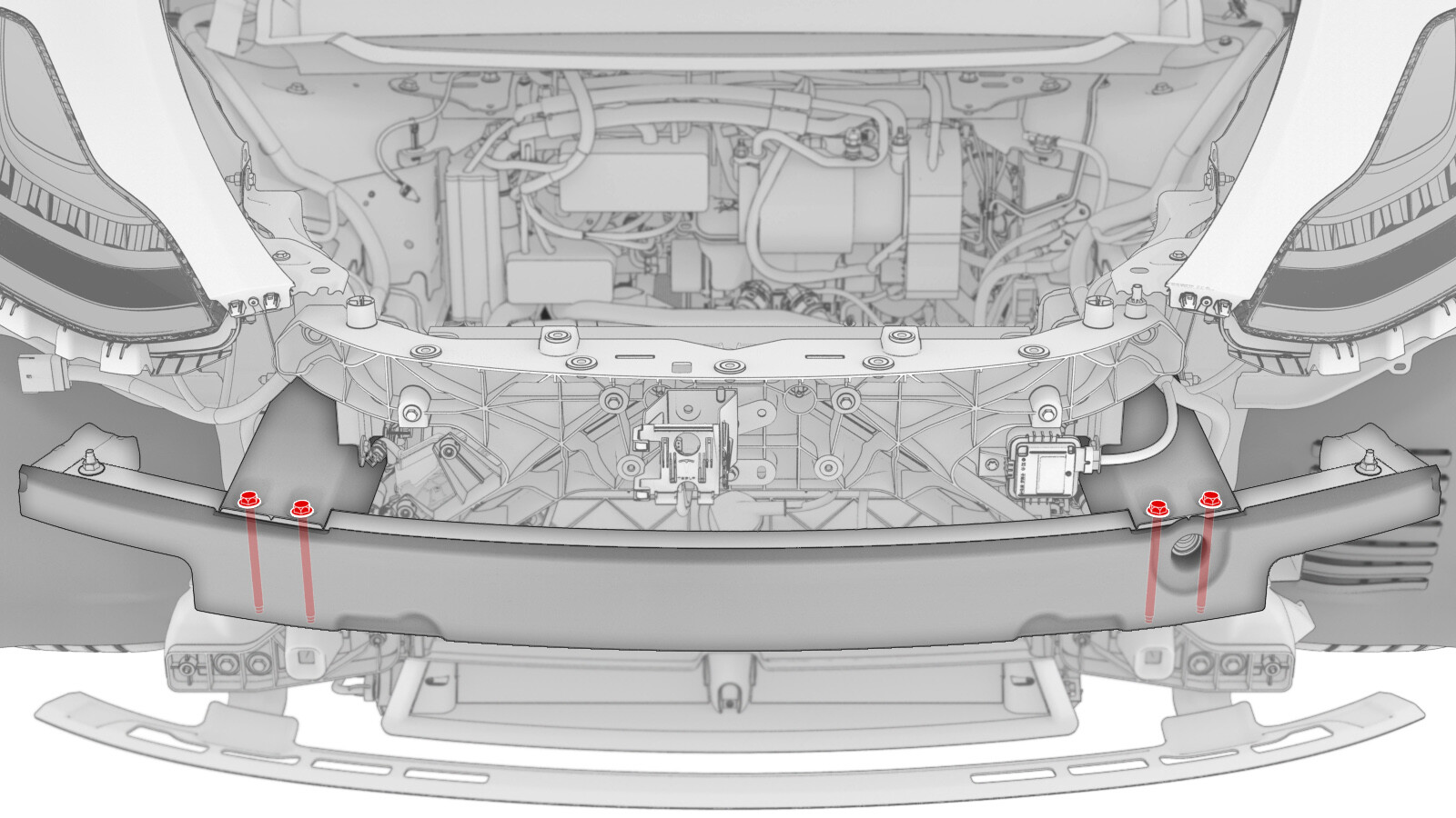 Remove the bolts that attach the LH and RH sides of the front bumper beam to the ankle catcher.