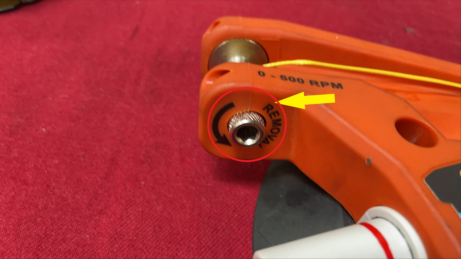 NoteFollow the instructions on the Spider tool. Feed the line through the opening of the cutting tool and tie a knot to secure the line in place. If the spindle is not turned the proper direction, the cutting tool will be damaged.
