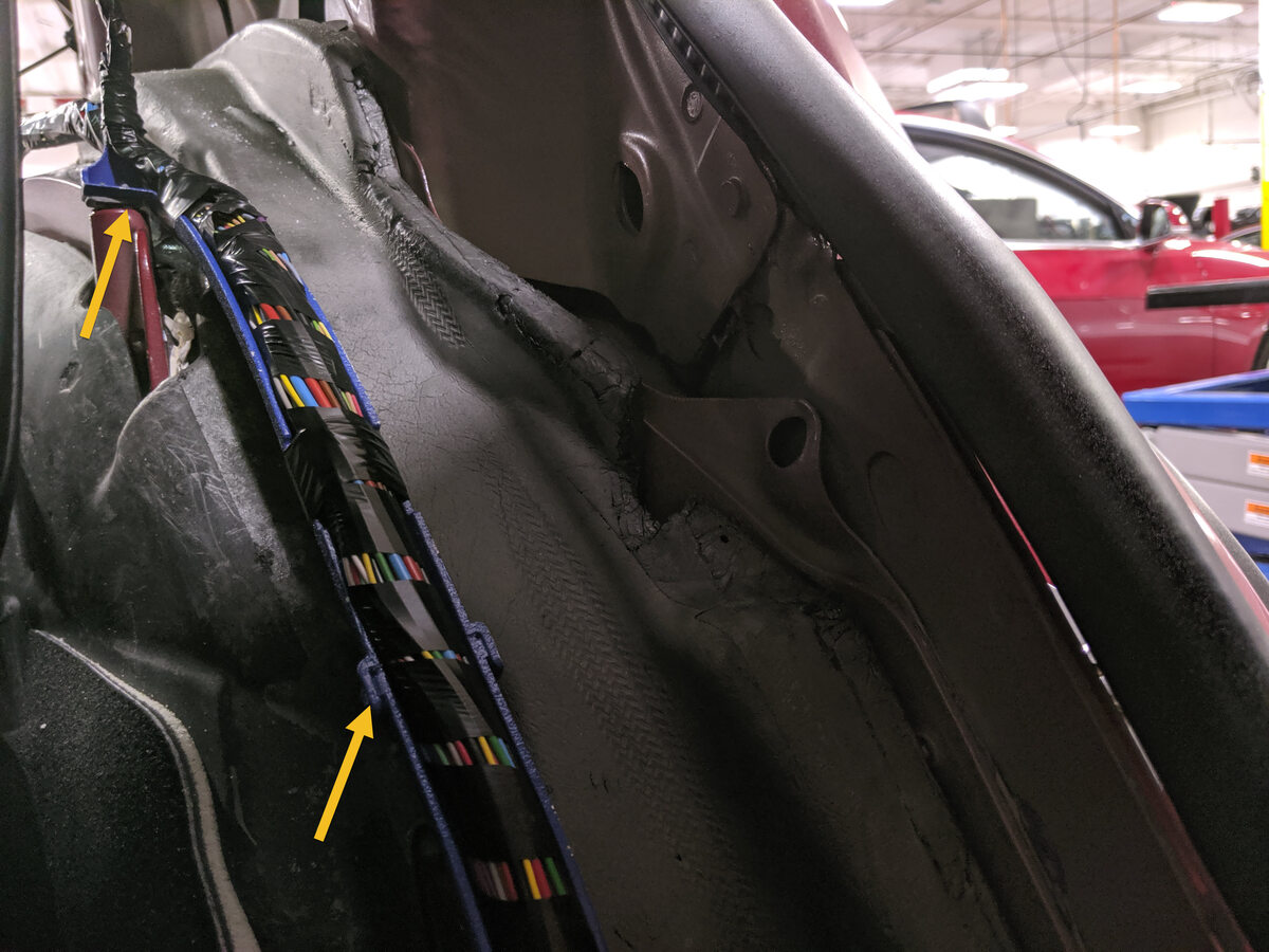Connect 12V outlet and trunk switch connectors then install top edge of LH 7s trunk side trim