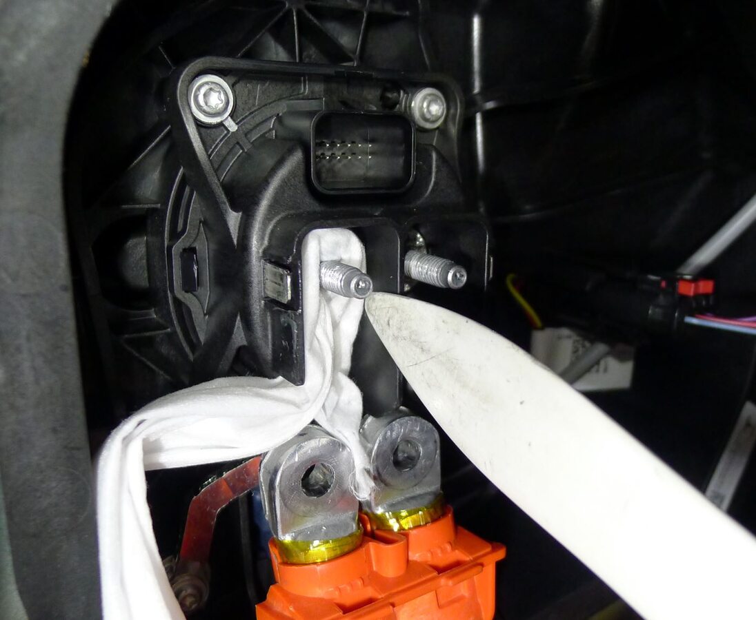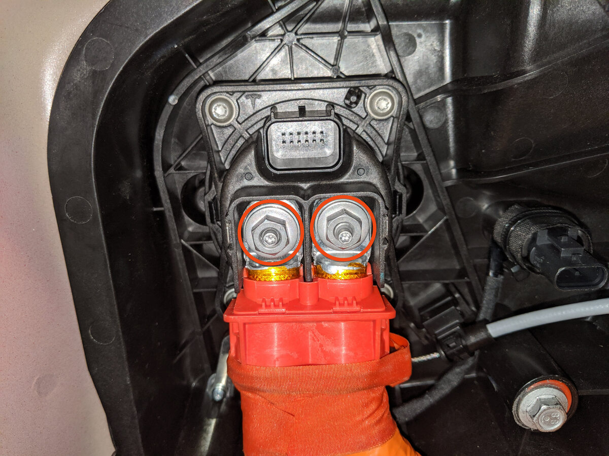 Remove fasteners securing charge port busbar to charge port and remove busbar leads from studs