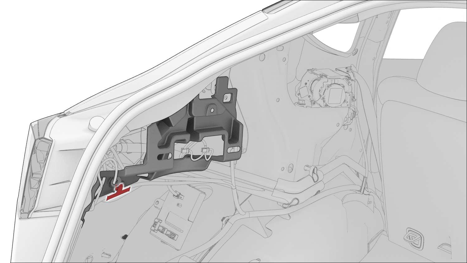 - Install the harness clip on the LH C-Pillar bracket.