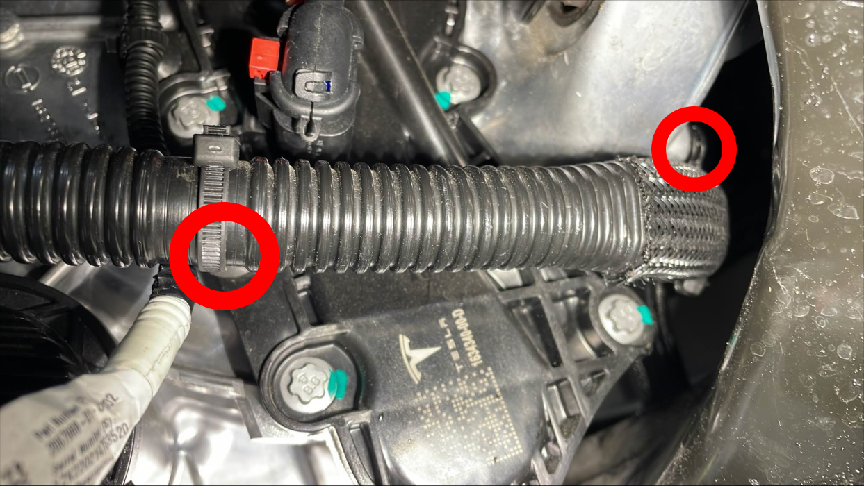 - Release the clips (x2) that attach the rear drive unit outlet hose to the rear skid plate.