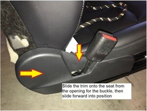 Note3x clips, Slide the trim onto the seat from the opening for the buckle, then slide forward into position