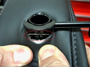 NoteDepress the material around the headrest post to expose the release clip, Ensure both tangs of the release tool engage the retaining spring, The release tool is rotated into position, Images show headrest removed for clarity