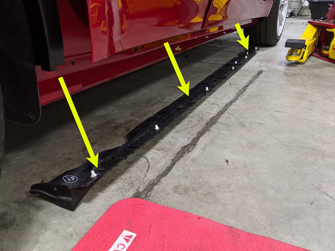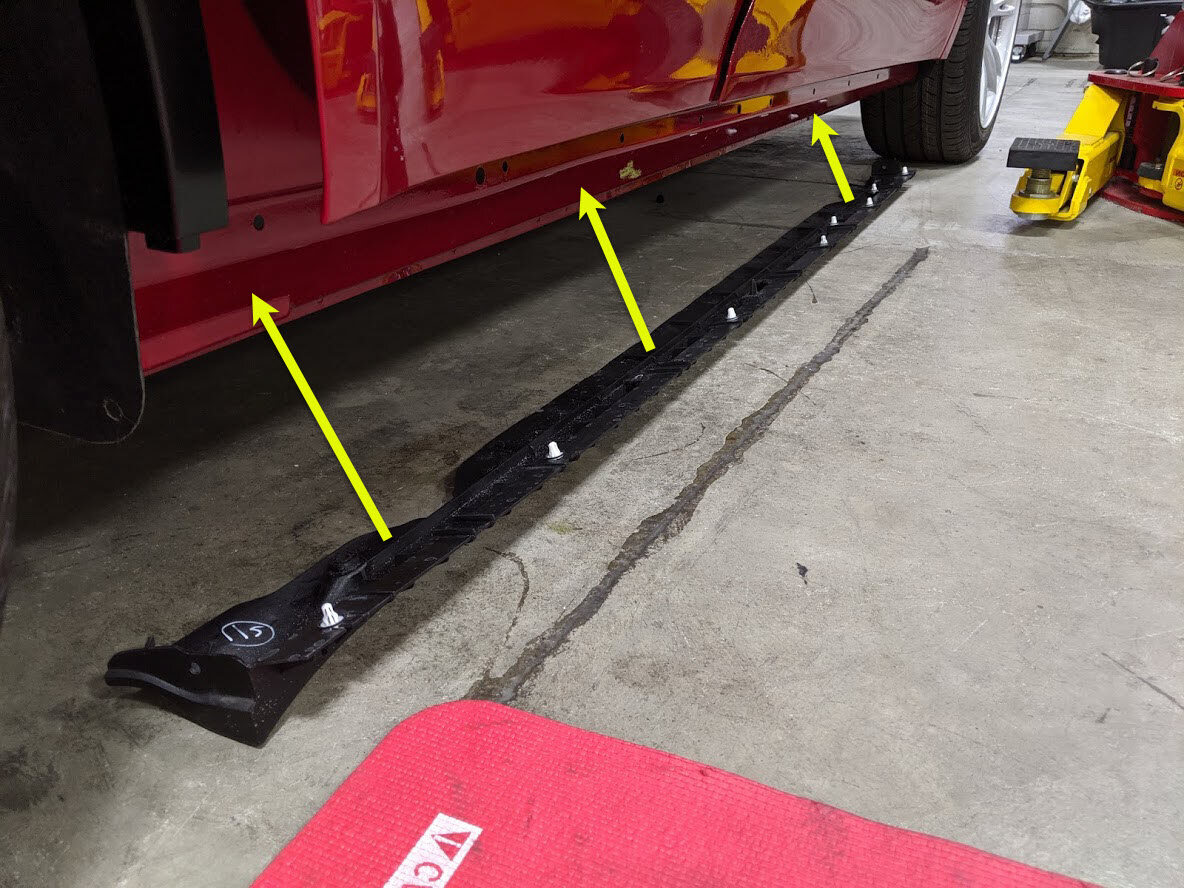 Note11x clips, 11x tabs, Work a plastic trim tool between door panel and rocker cover to release tabs