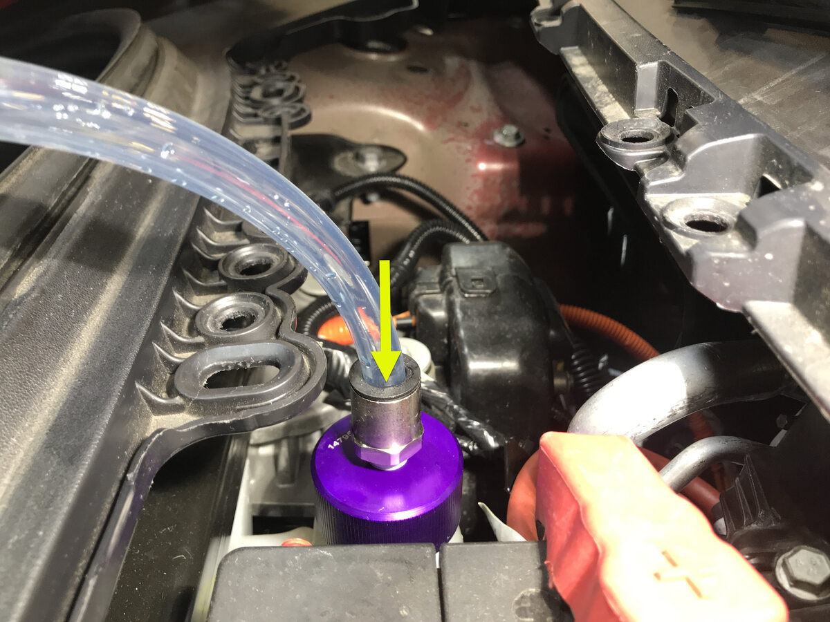 - Remove vacuum refill hose from refill cap on coolant bottle