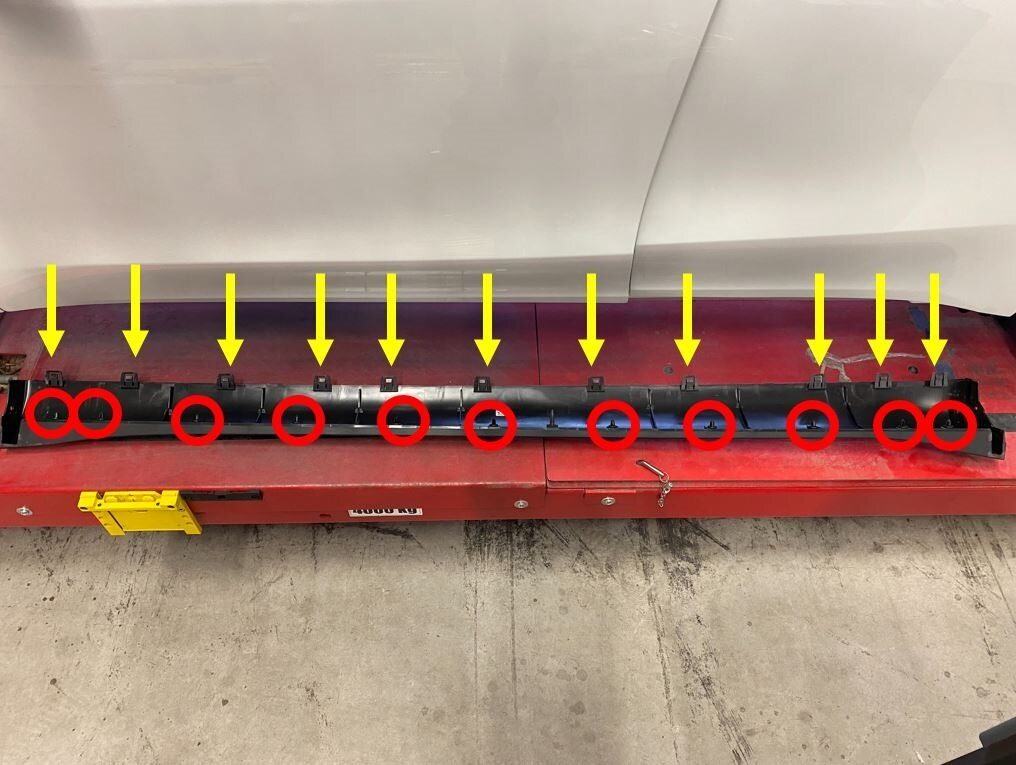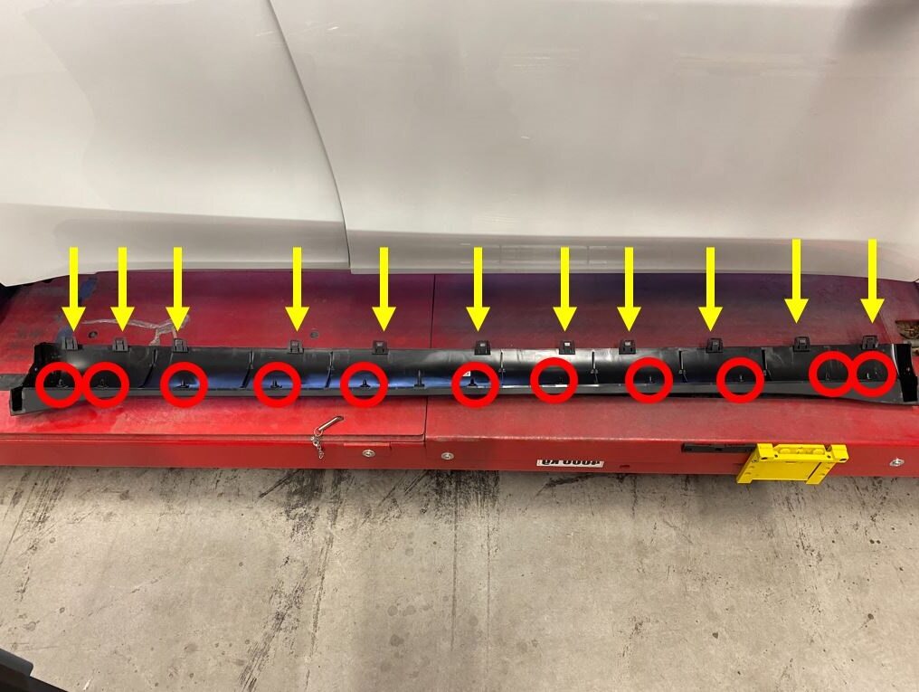 Note11x clips, 2x guide pins, Use trim tool starting at top edge to release upper clips, then pull bottom to release remaining clips, Use caution and pull panel straight away from console, if panel is peeled off it could be damaged