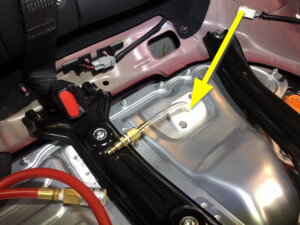 - Position coolant drain container underneath LH rear of HV battery