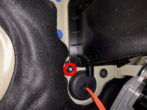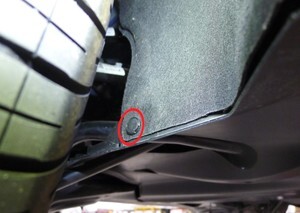 Remove upper nut securing HV battery rear skid plate enclosure