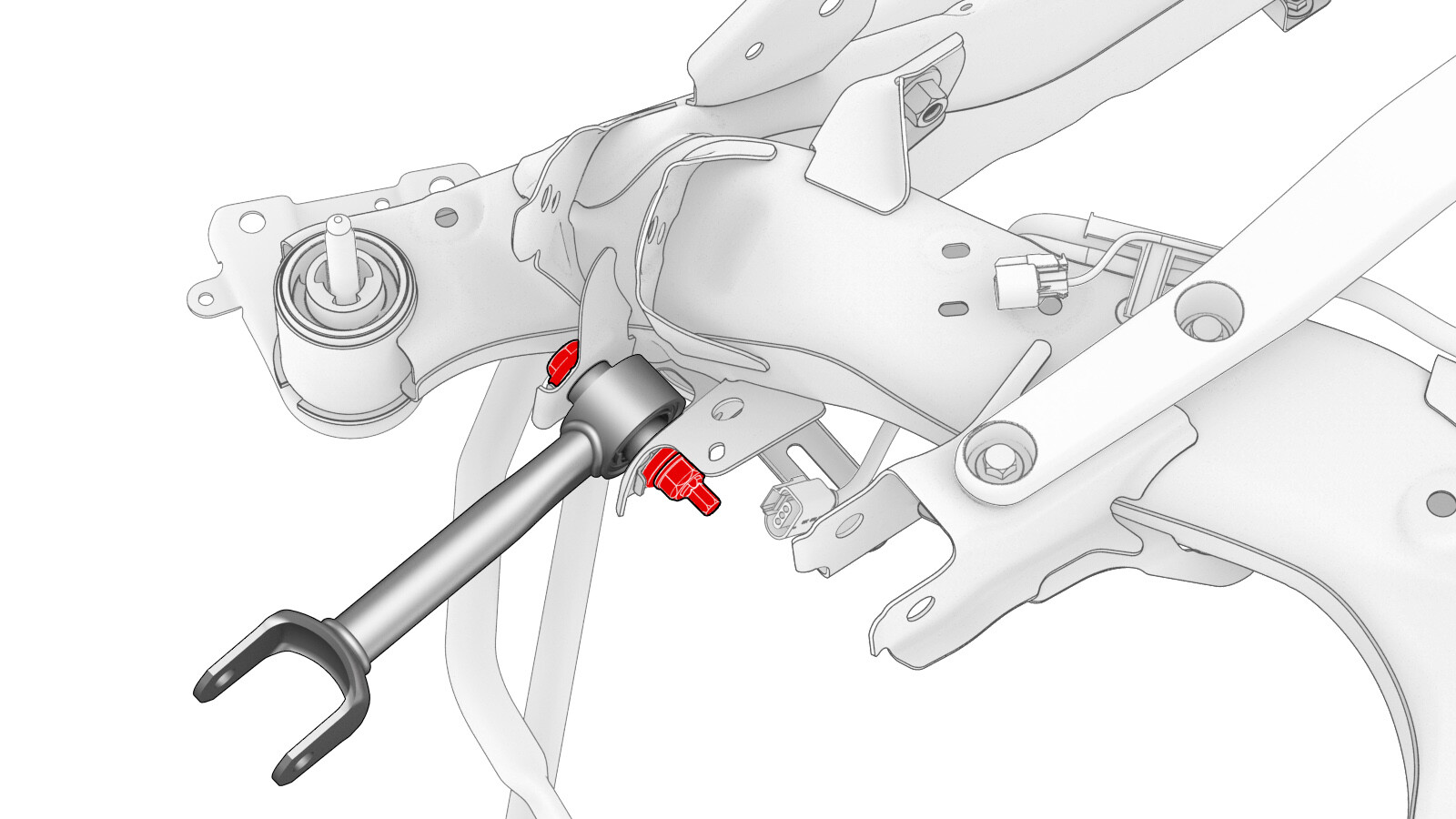 that attach the RH toe link to the RH rear suspension knuckle. Mark the bolt