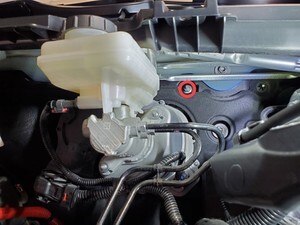 Note2x bolts, 10mm, 5 Nm, Pivot forward edge down past frunk assembly, then carefully move rear edge past brake reservoir and into position