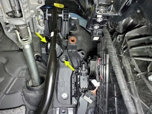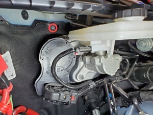 Note2x bolts, 10mm, 5 Nm, Pivot rearward edge up and past brake reservoir, then lift up to clear frunk assembly