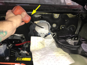 Remove bolt securing frunk to washer fluid reservoir neck