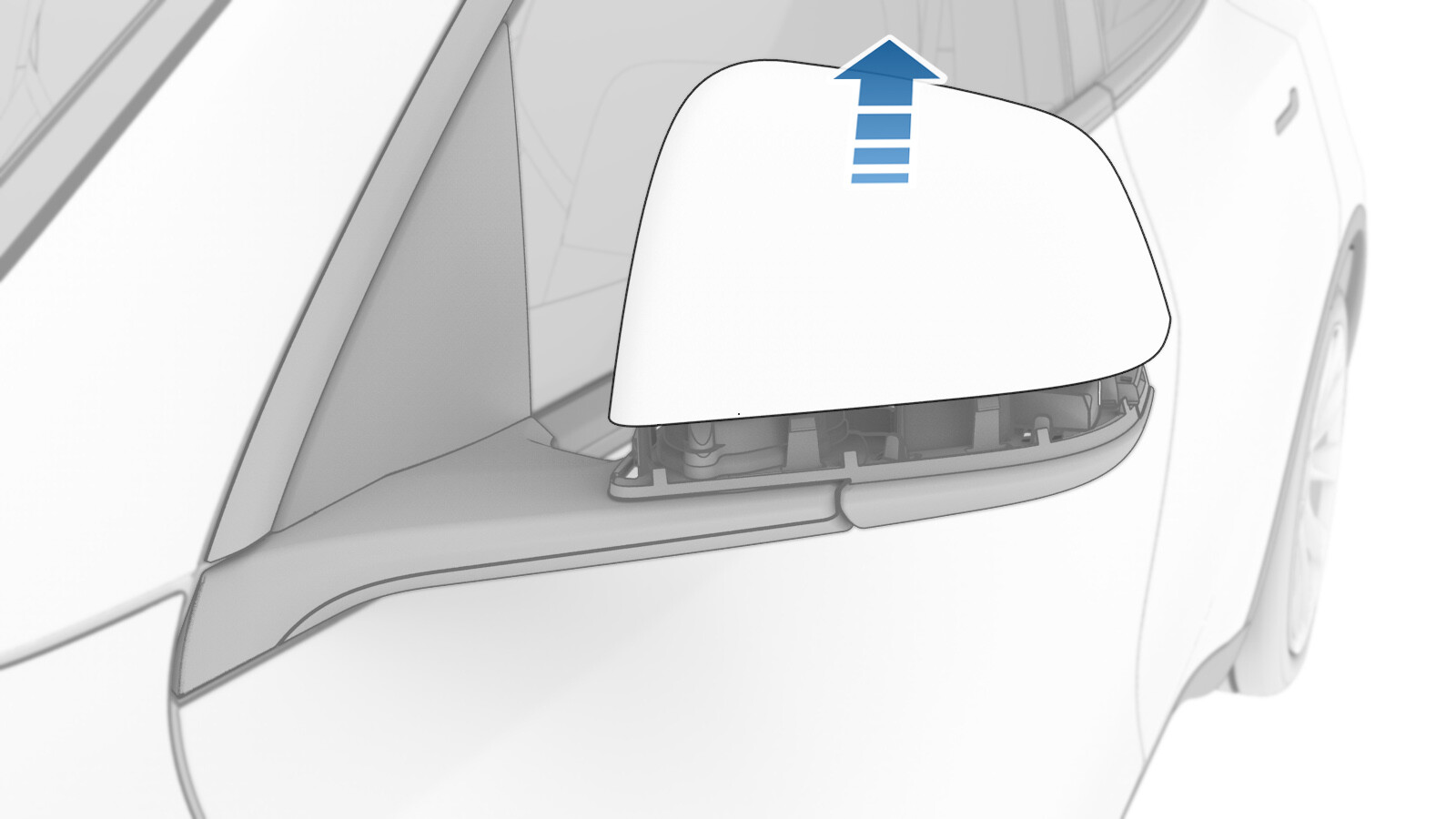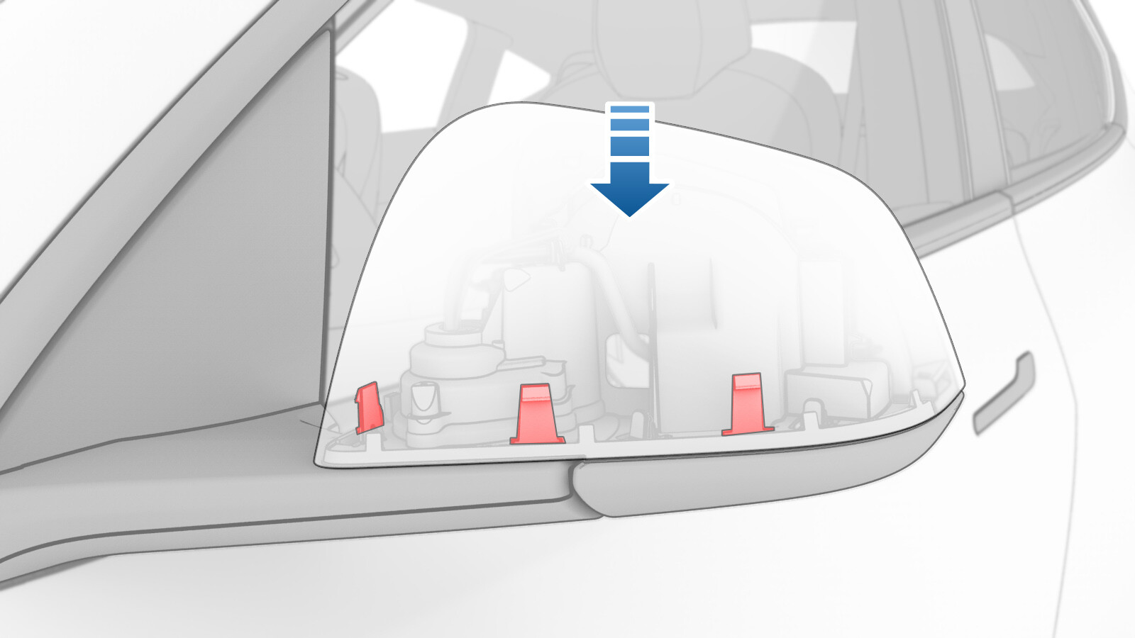 - Position the door mirror skull cap over the door mirror assembly, and align the skull cap clips to the tabs on the door mirror assembly.