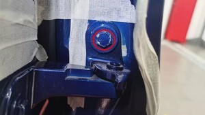 - Apply masking tape to the area surrounding the LH rear door upper hinge on the body and door to aid in alignment during installation.