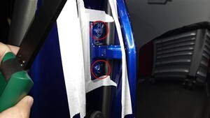 - Use the alignment tape to position the LH rear door upper hinge onto the body, and then hand tighten the bolts that attach the hinge to the body.