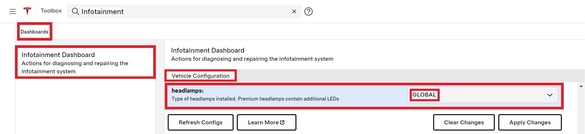 In Toolbox 3, click on the Dashboards tab, search for “infotainment”, click , and then change the "headlamps" configuration to "GLOBAL".