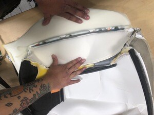 - Release the strap that attaches the seat cushion trim to the foam pad.