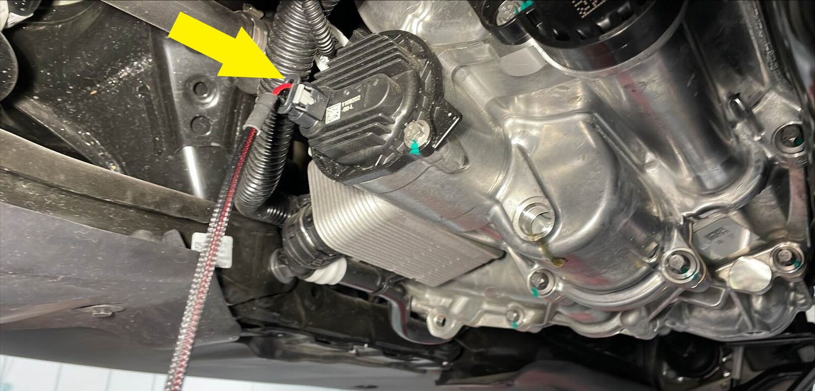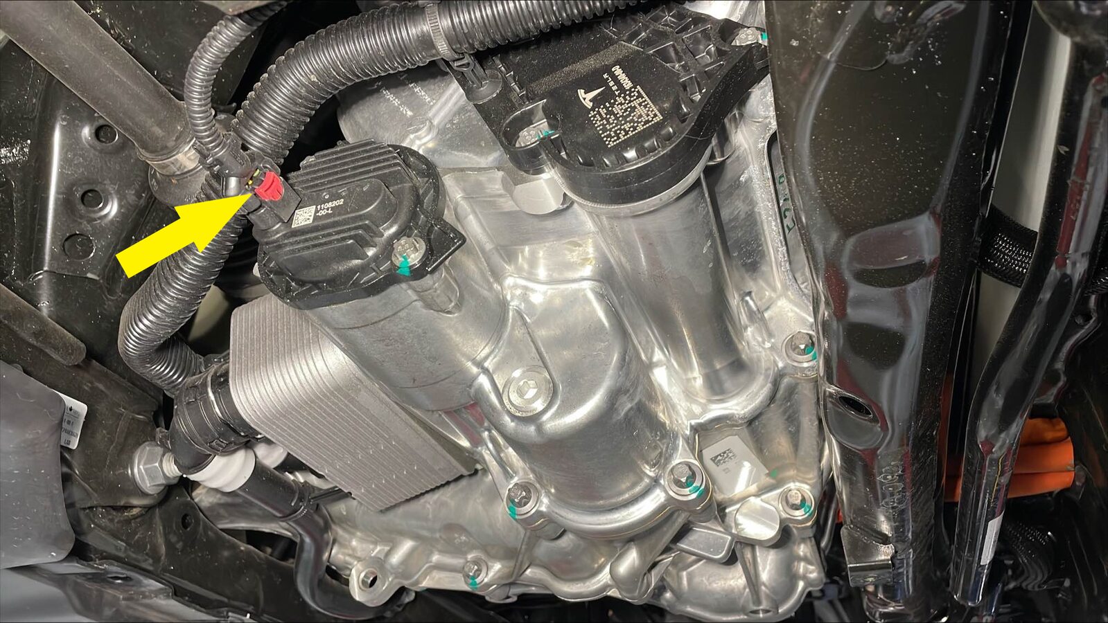 - Pull the red tab, and then pull the red tab again to disconnect the rear subframe harness from the rear drive unit oil pump connector.
