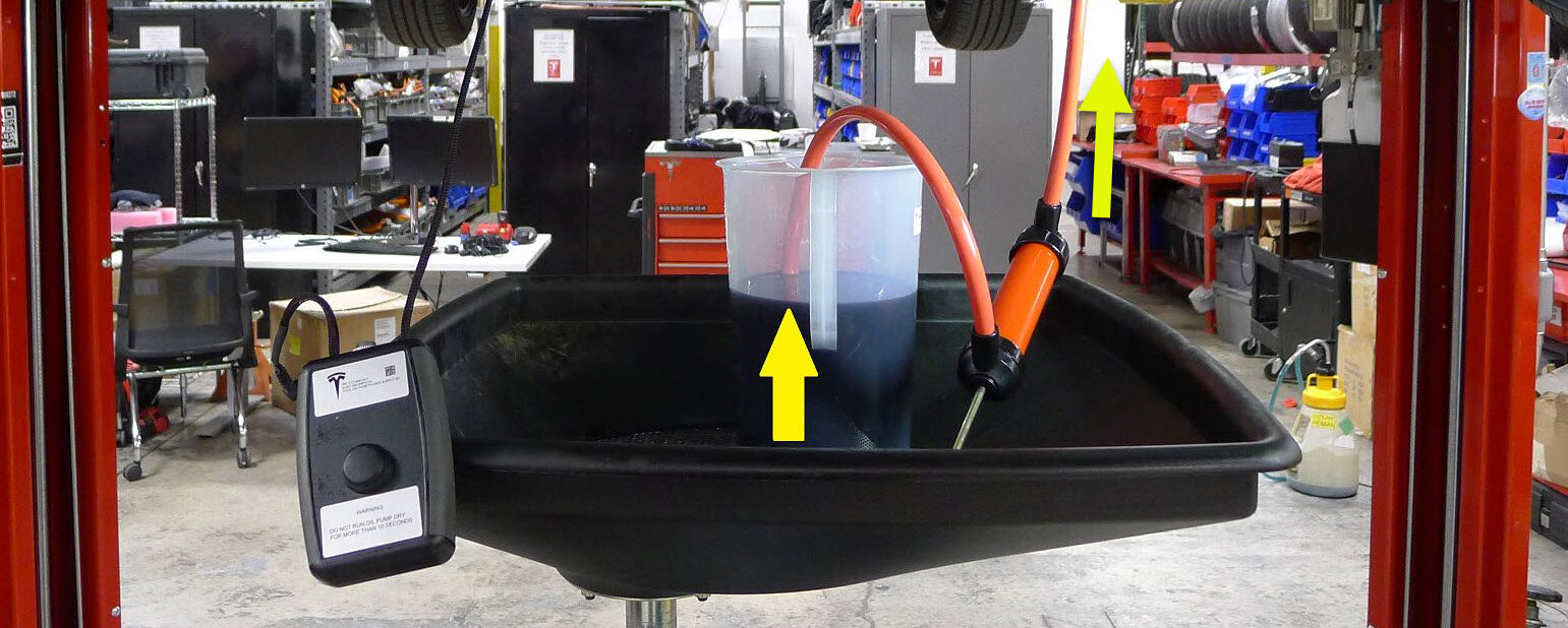 - Place the measuring container and the fluid transfer pump into the oil drain basket.