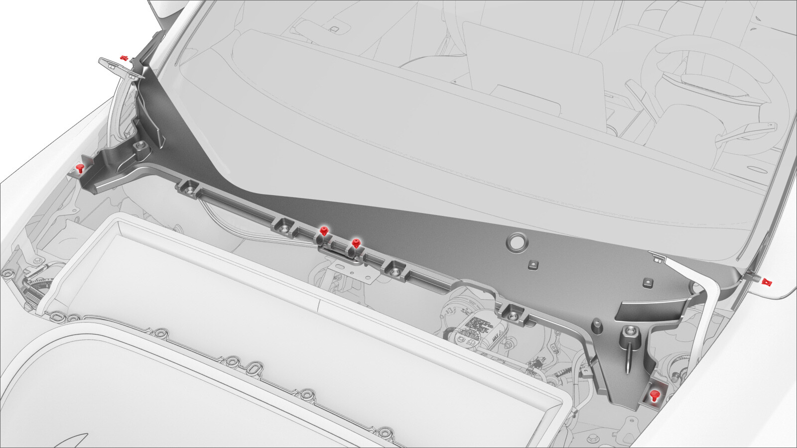 - Release the clips that attach the cowl screen panel to the vehicle, and then remove the cowl screen panel from the vehicle.