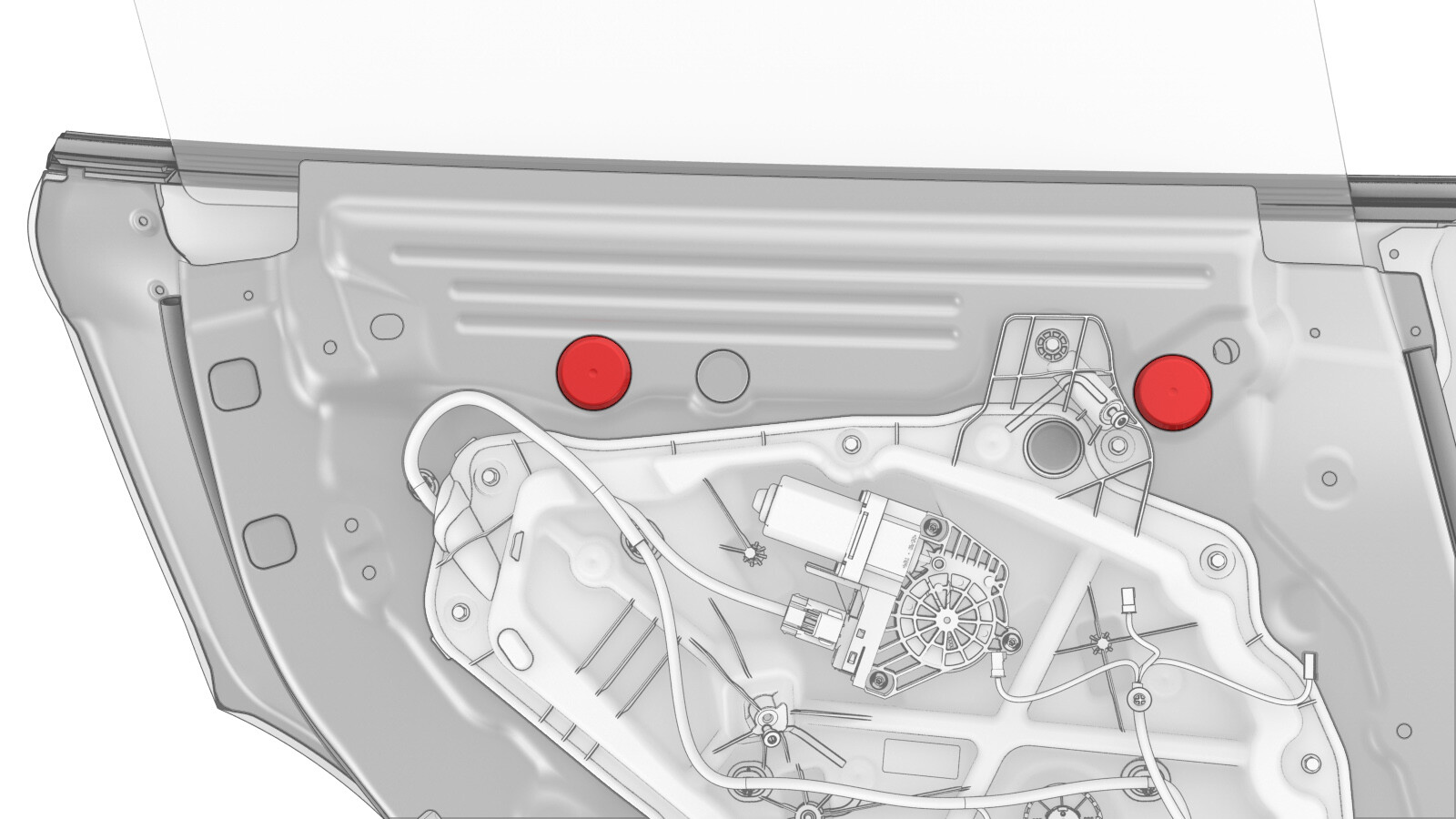 - Remove the plugs that cover the opening in the door for access to the regulator guide block bolts.