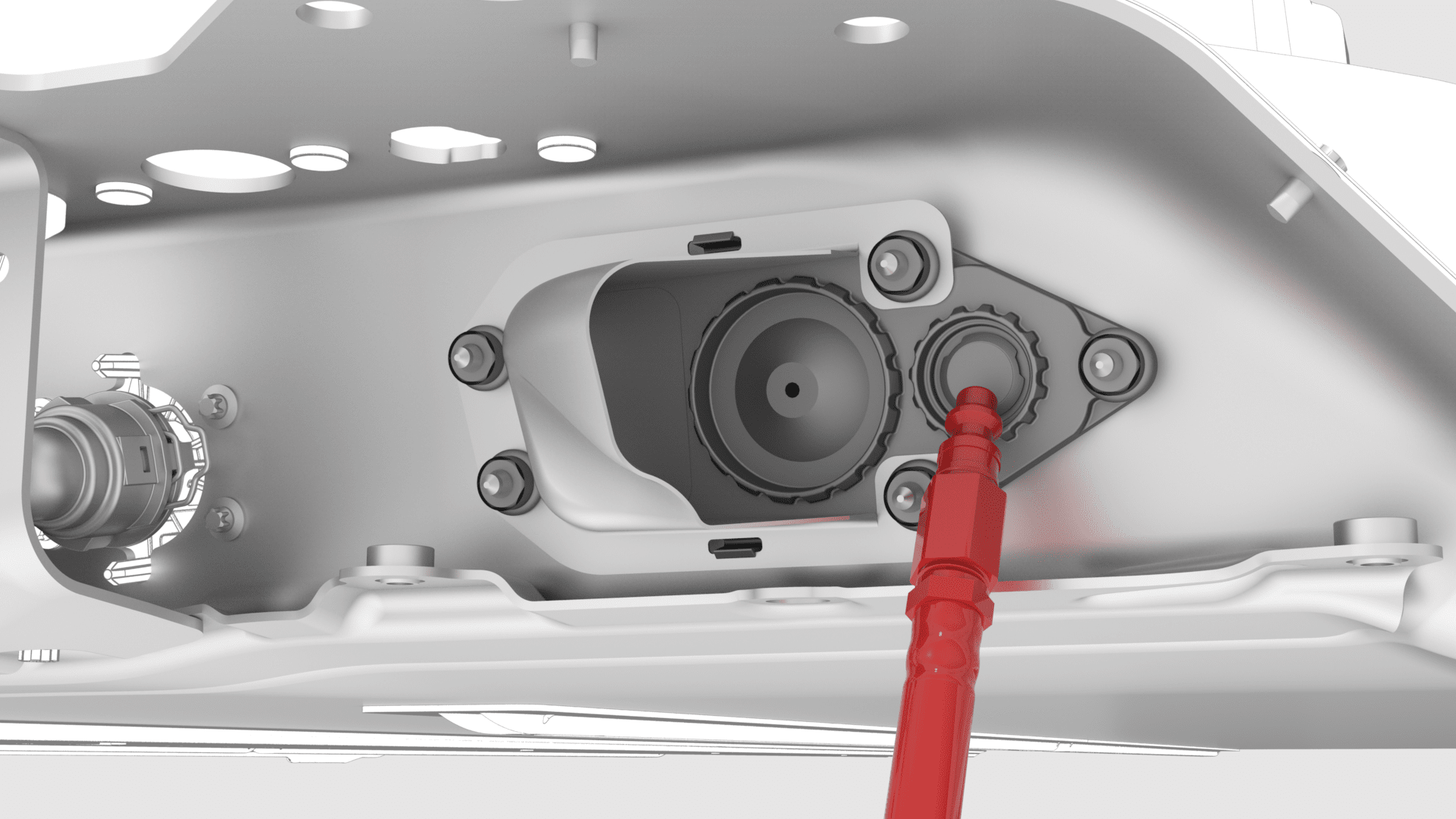 - Connect the pack enclosure leak tester to the leak test adapter in the LH HV battery shroud assembly.