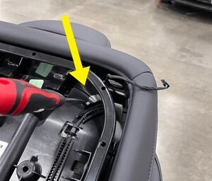 - Use a pry tool to insert the shoulder switch connection between the seatback and seat frame, and then route the harness onto the seat assembly.