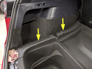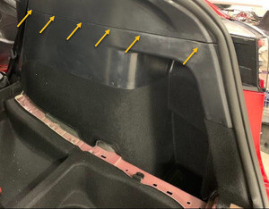 Note5x clips, Rear edge is mated with groove in trunk side trim, Install rear edge of RH rear sill trim into trunk side trim and work your way forward securing clips