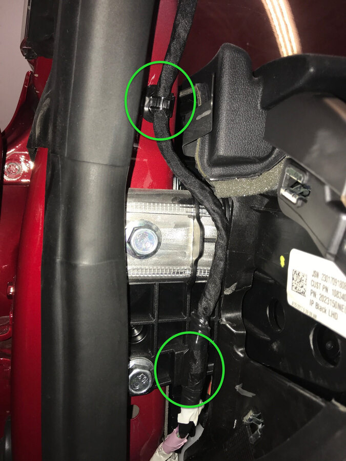 Note1x push clip, 5x clips, Guide front clip stanchions around LH C-pillar