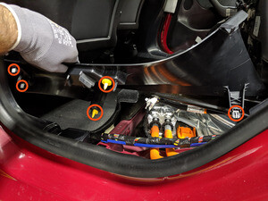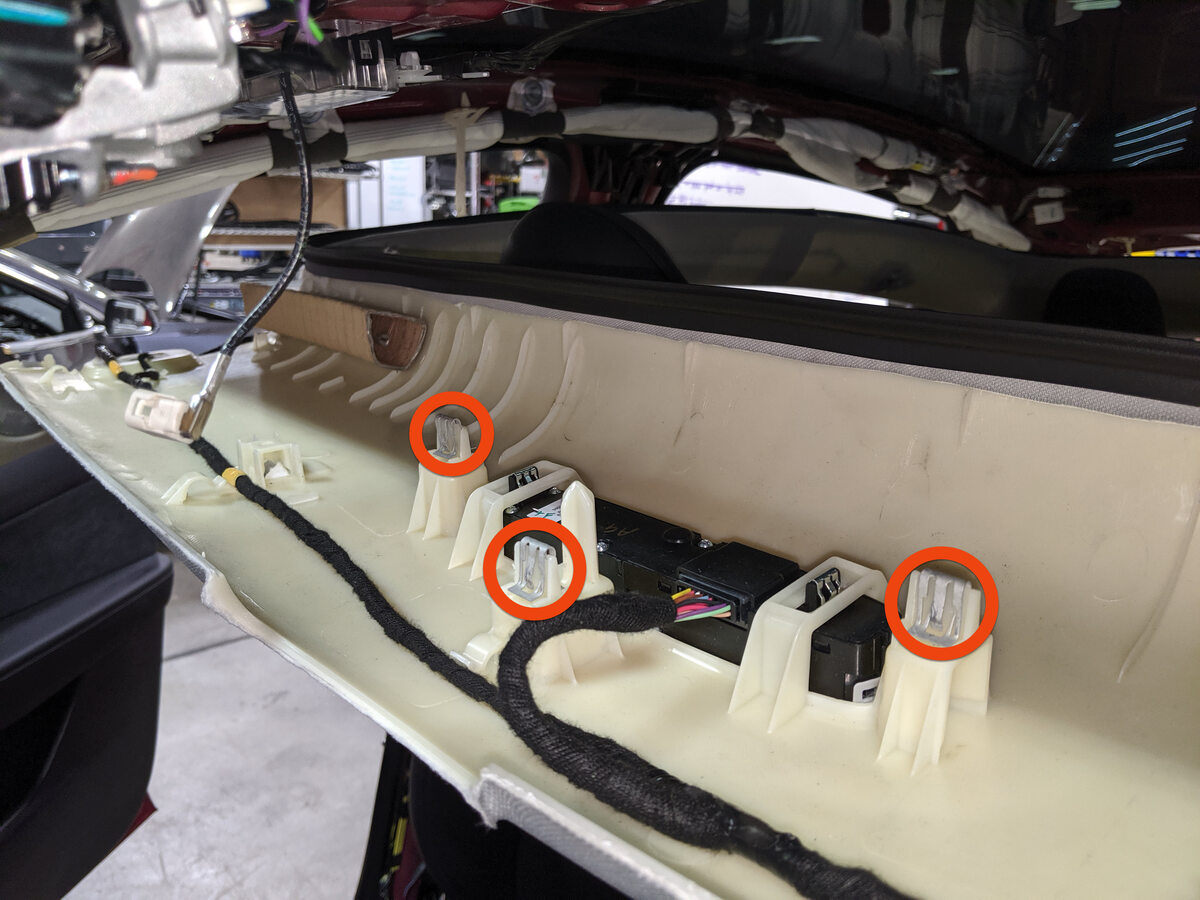 Note3x clips, 1x tether, Slide bottom of trim along IP and speaker grill, attach tether to body side, Set clips starting at the bottom and work up, Pull seal over trim