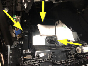 Note2x screws, T20, 2 Nm, 1x push clip, 4x patch bolts, E10, 8 Nm, Discard patch bolts after removal, Support the knee air bag while lowering, The connector / harness length is very short