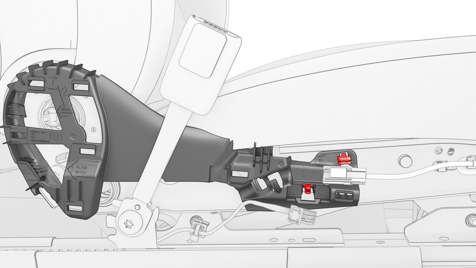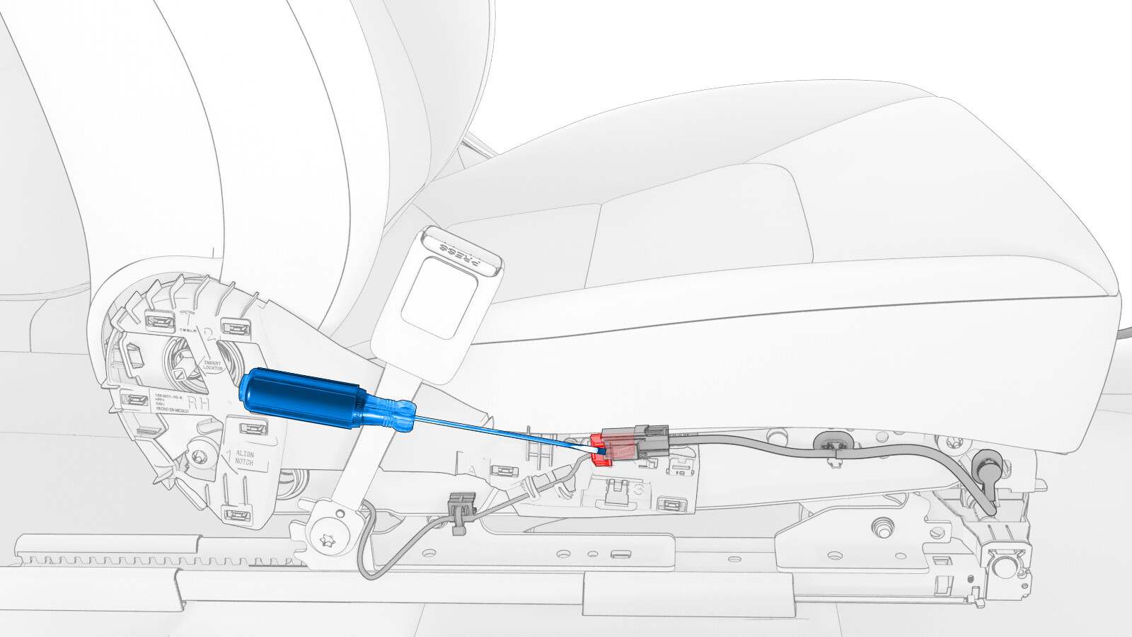 - Use the screwdriver to disconnect LH front seat buckle connectors (x2).