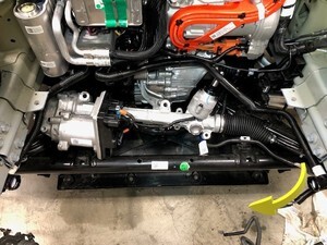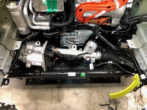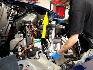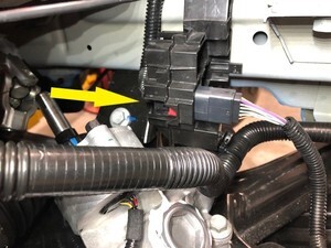 - Release the connector locks, disconnect the steering gear assembly connectors (x2), and then move the 12V steering gear harness aside for clearance.