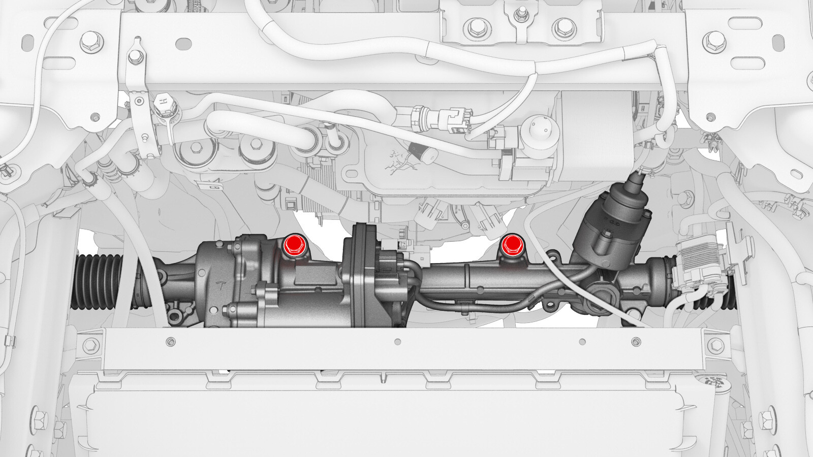 | Outer bolts (x2) that attach the steering gear assembly to the front subframe |