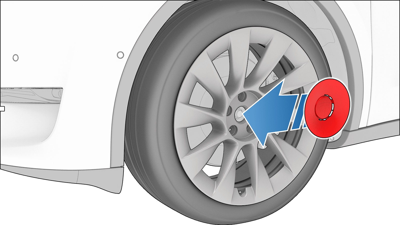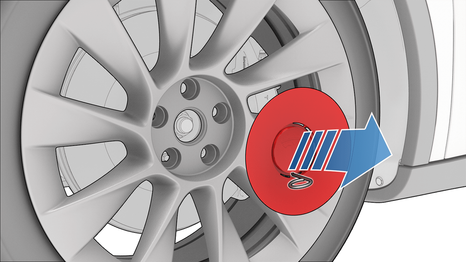 - Place the curved part of the lug nut cover tool into the lowered perimeter around the middle of the lug nut cover, twist the tool so that the cured part faces away from the Tesla "T", and then pull the tool to remove the center cap.