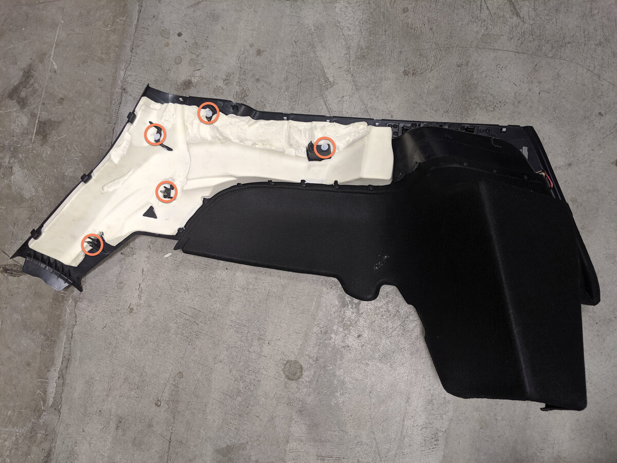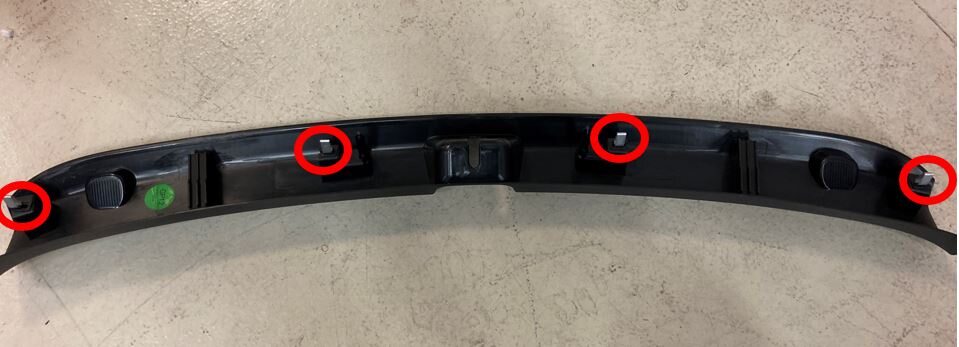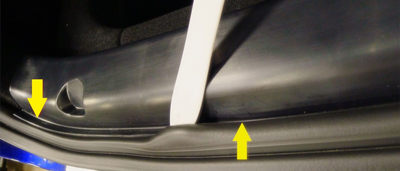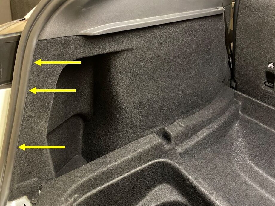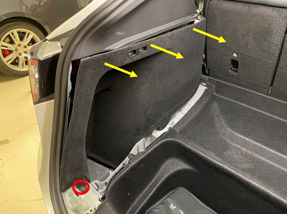 Note5x clips, Rear edge is mated with groove in trunk side trim, Release clips at front of LH Lower C-Pillar trim working your way back towards rear of sill trim, trim part may slightly differ, by vehicle build location,Clip position should not be adjusted after bracket is removed or will result in bracket not seating properly later.