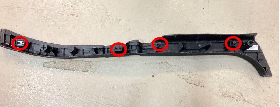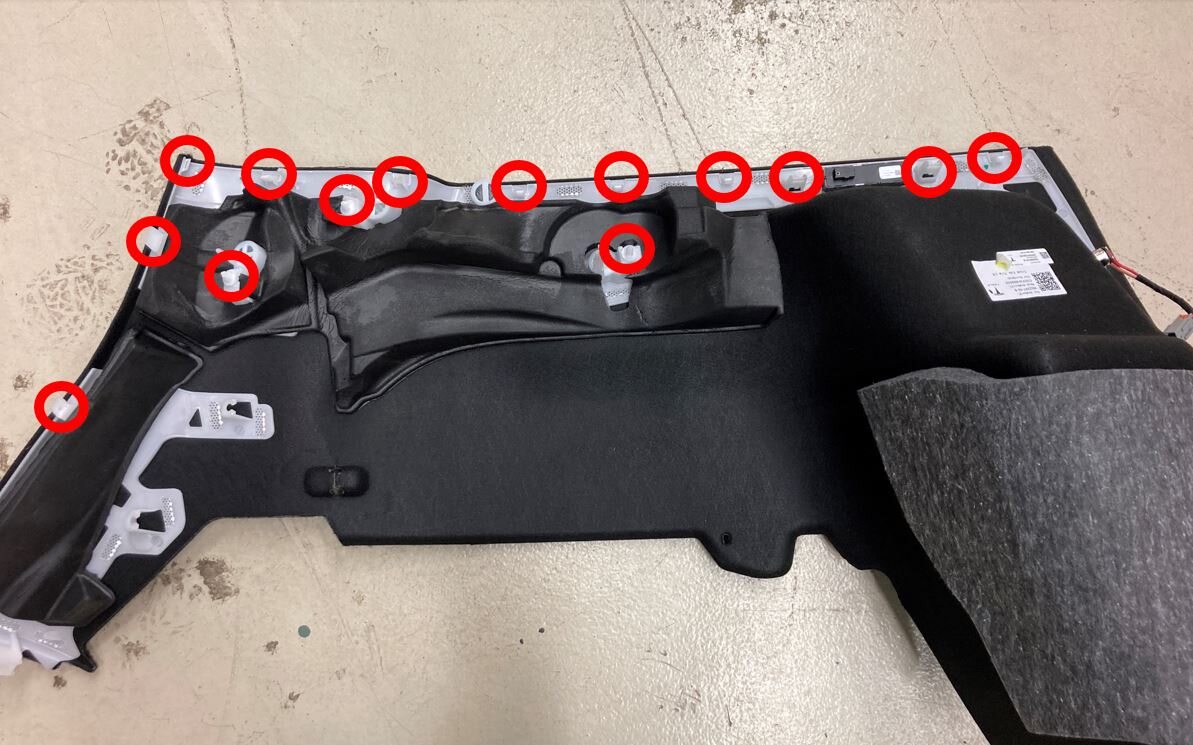Note2x connectors, 1x push clip, 8x clips, 7x tabs, guide front clip stanchions around LH C-pillar, trim part may slightly differ by vehicle build location, and the number of clips may also vary.