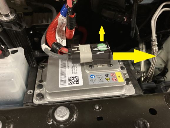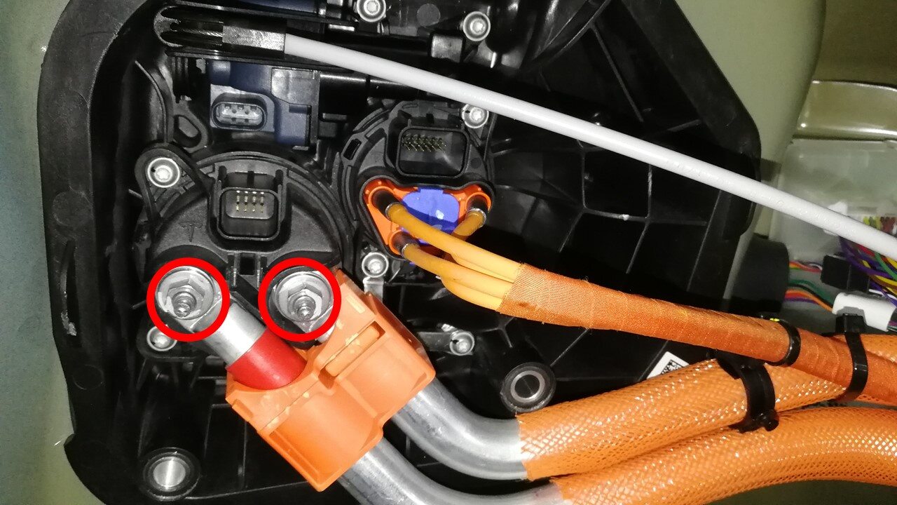 NoteMake sure to wear PPE (HV gloves, safety glasses) when working on high voltage component, Be sure to place the positive test lead on the side of the HV pin just past the plastic protective covers Measure the voltage between B+ (the two dead front pins) to B- (rear left door striker as a ground for the isolation check), If voltage is greater than 10V, pack contactors are not open or welded, Stop work and reach out to Service Engineering.