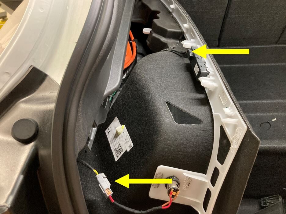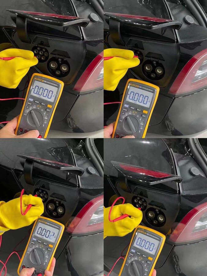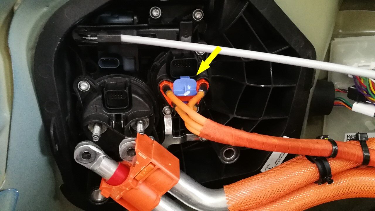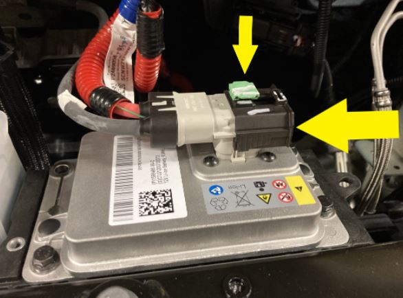 NoteMake sure to wear PPE (HV gloves, safety glasses) when working on high voltage component, Be sure to place the positive test lead on the side of the HV pin just past the plastic protective covers Measure the the voltage between B+ (the four dead front pins) to B- (rear left door striker as a ground for the isolation check), If voltage is greater than 10V, pack contactors are not open or welded, Stop work and reach out to Service Engineering.