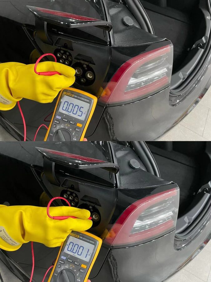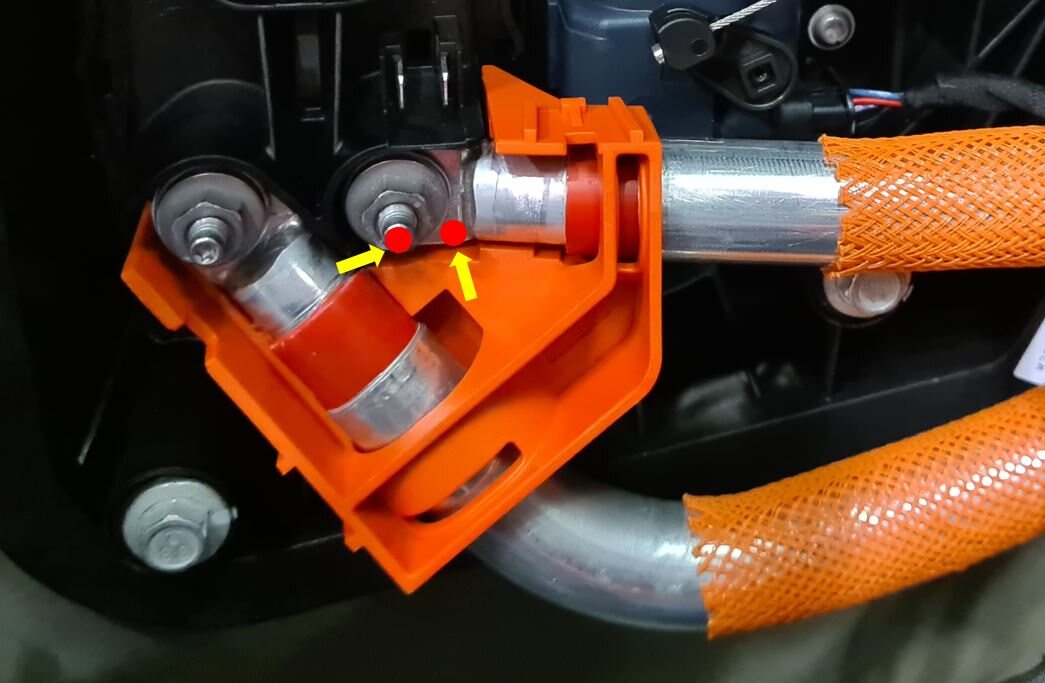 Note2x HV joints, The acceptable resistance is between 0.050 mΩ (50 μΩ) and 0.270 mΩ (270 μΩ).If the resistance is greater than 0.270 mΩ (270 μΩ), there is too much resistance in the High Voltage joint. Remove the fastener, clean areas with isopropyl alcohol, install fastener back and test again.If the resistance is lower than 0.050 mΩ (50 μΩ), reposition the probes and measure again.If the resistance is repeatedly between 0.00 mΩ and 0.050 mΩ (50 μΩ), hioki test passed, proceed to next step.