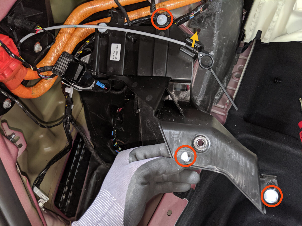 Note2x bolts, 10mm, 5 Nm, Pivot rearward edge up and past brake reservoir, Then lift up to clear frunk assembly