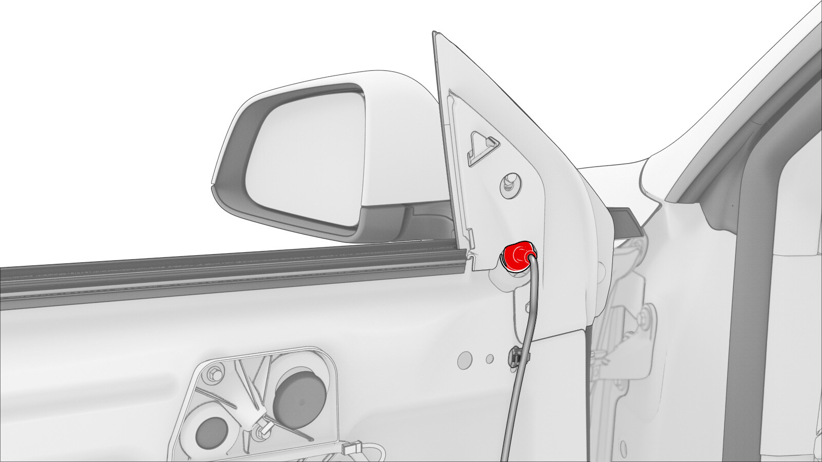 - Push the grommet through the door, and then route the electrical harness through the door as you remove the mirror assembly.
