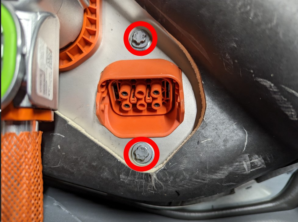 Install the bolts (x2) that attach the charge port busbars to the HV