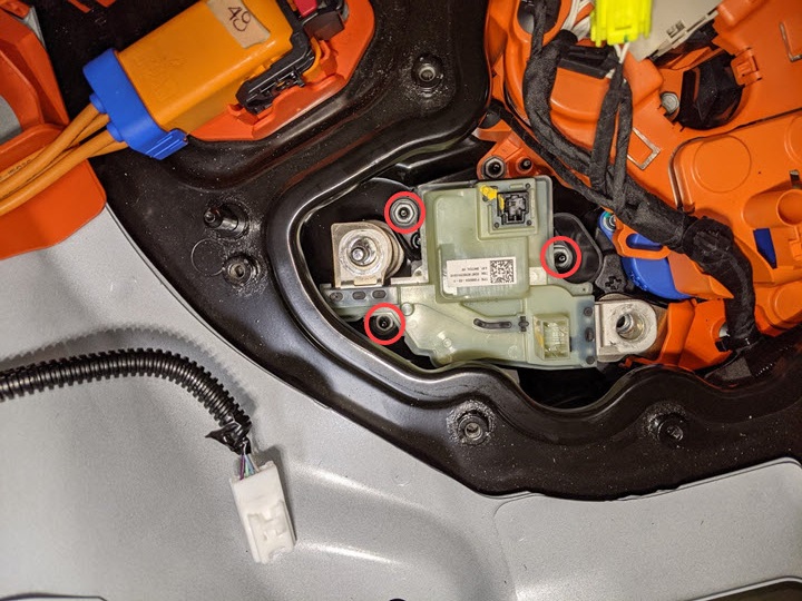 Install the HV battery negative contactor into the ancillary bay, and then install the nuts (x2 or x3) that attach the contactor into the ancillary bay.