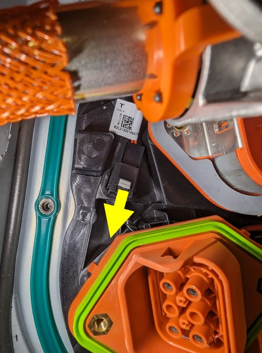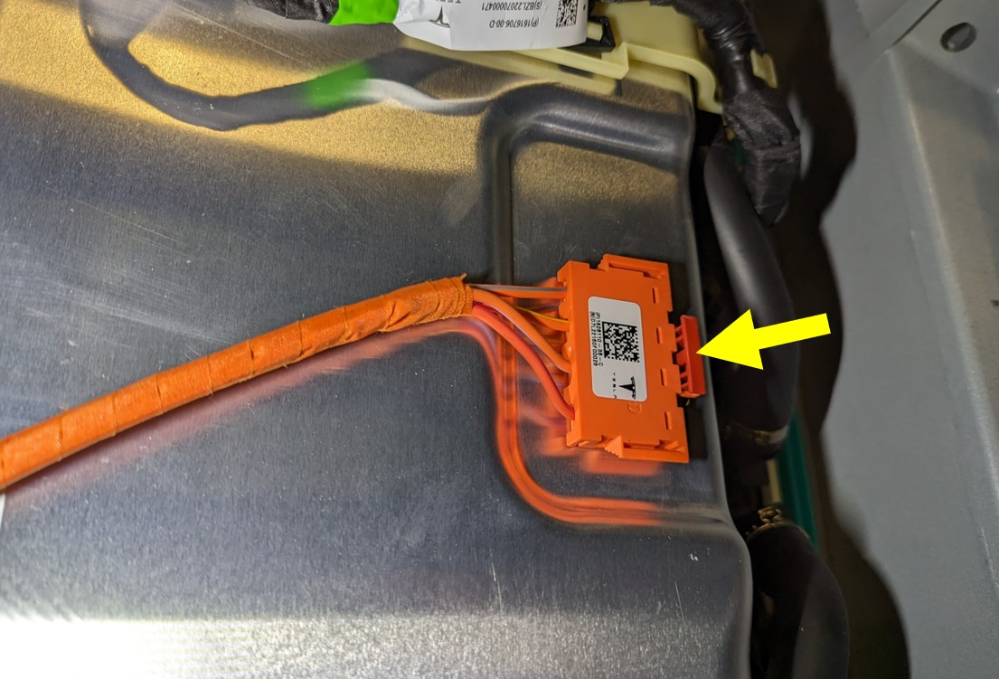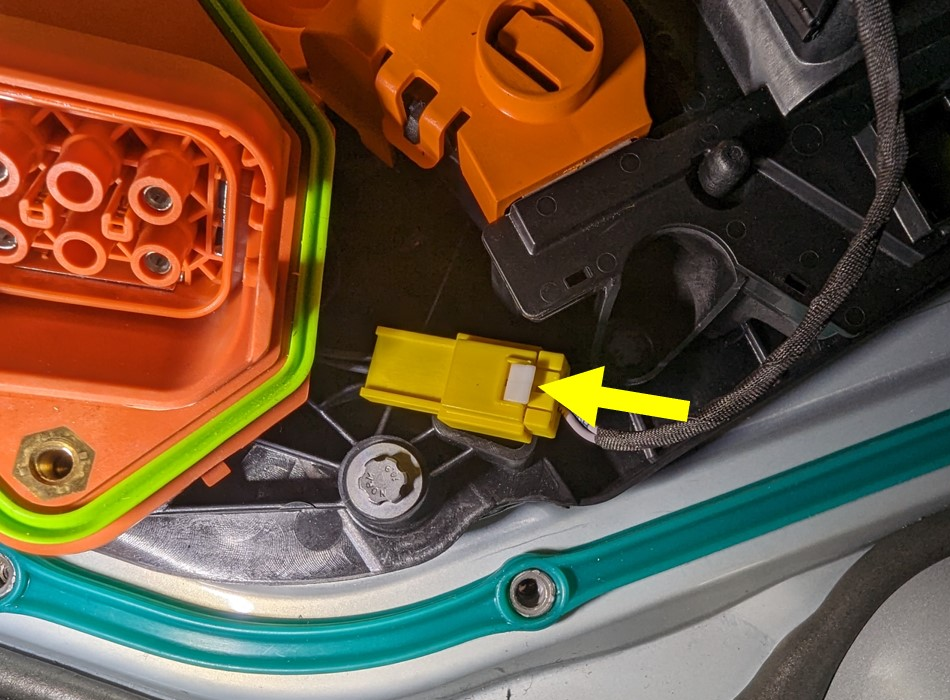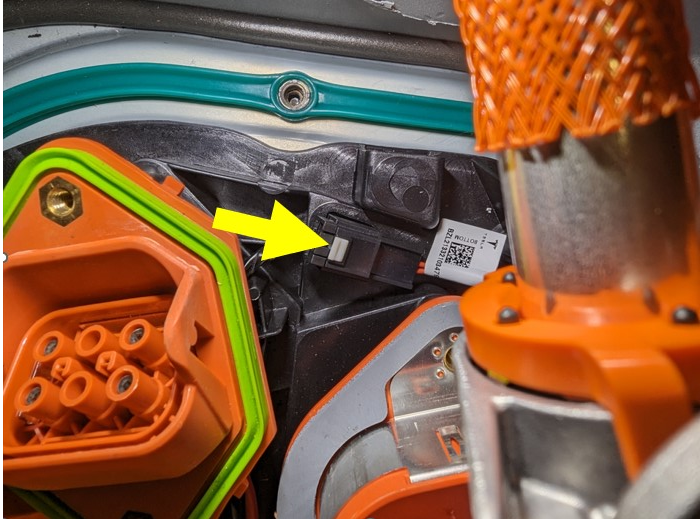 - Release the locking tab, and then disconnect the charge inlet connector.