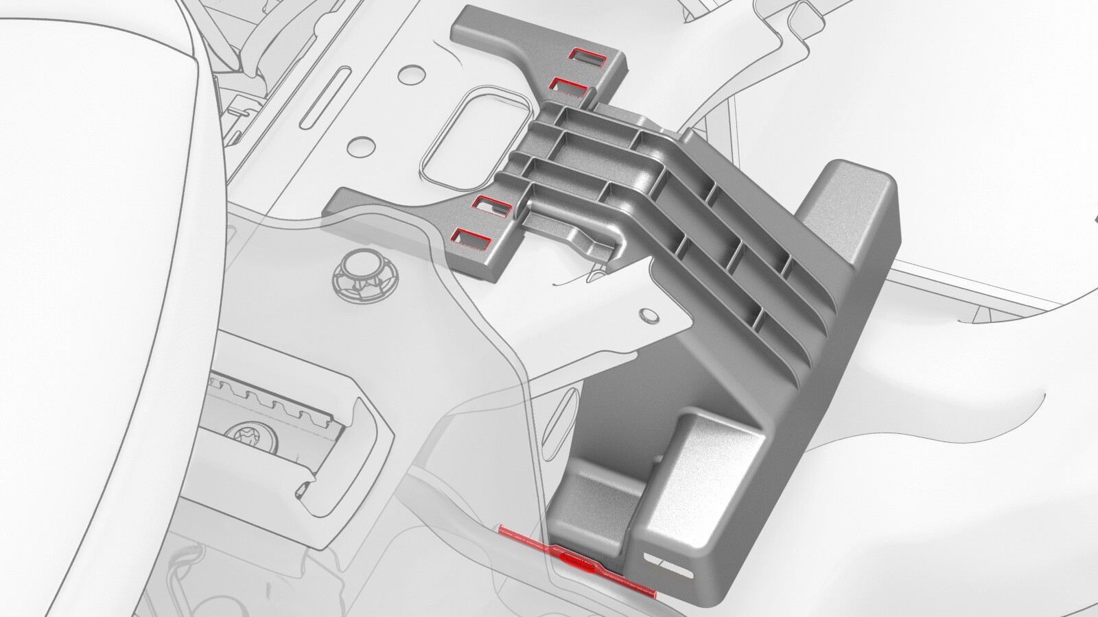 - Position the center console support bracket on the vehicle, slide the bracket rearward, and then install the harness clip (x1) and tabs (x4) that attach the bracket to the vehicle.
